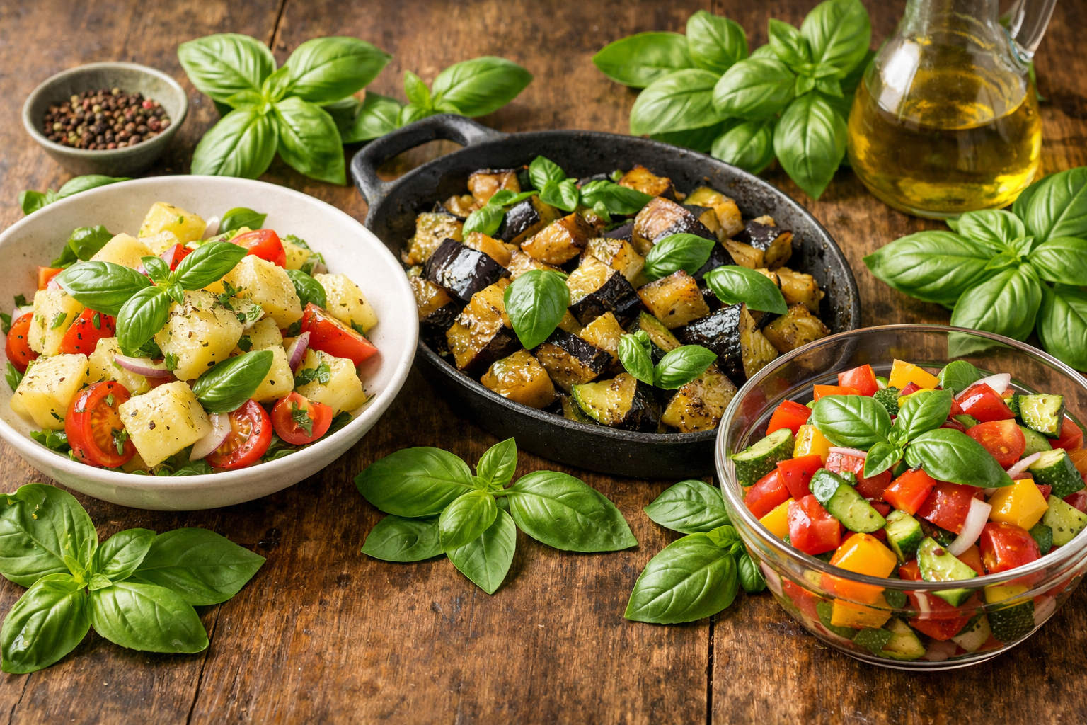 この章では、じゃがいもとバジルの温サラダ、なすとズッキーニのバジル炒め、そして彩り野菜のバジルマリネを通して、野菜副菜におけるバジルの使い方を見ていきます。副菜でバジルを使いこなせるようになると、食卓全体の完成度が一段上がります。