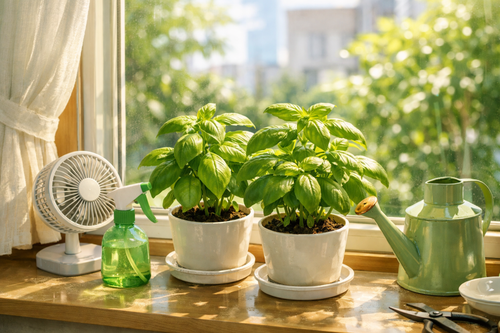 バジルは風が強すぎるのは苦手でも、空気がまったく動かない状態も得意ではありません。風通しが悪いと、葉が乾きにくくなり、蒸れたり病気が出やすくなったりします。せっかく室内で雨を避けられても、空気がよどんでいては株が苦しくなります。