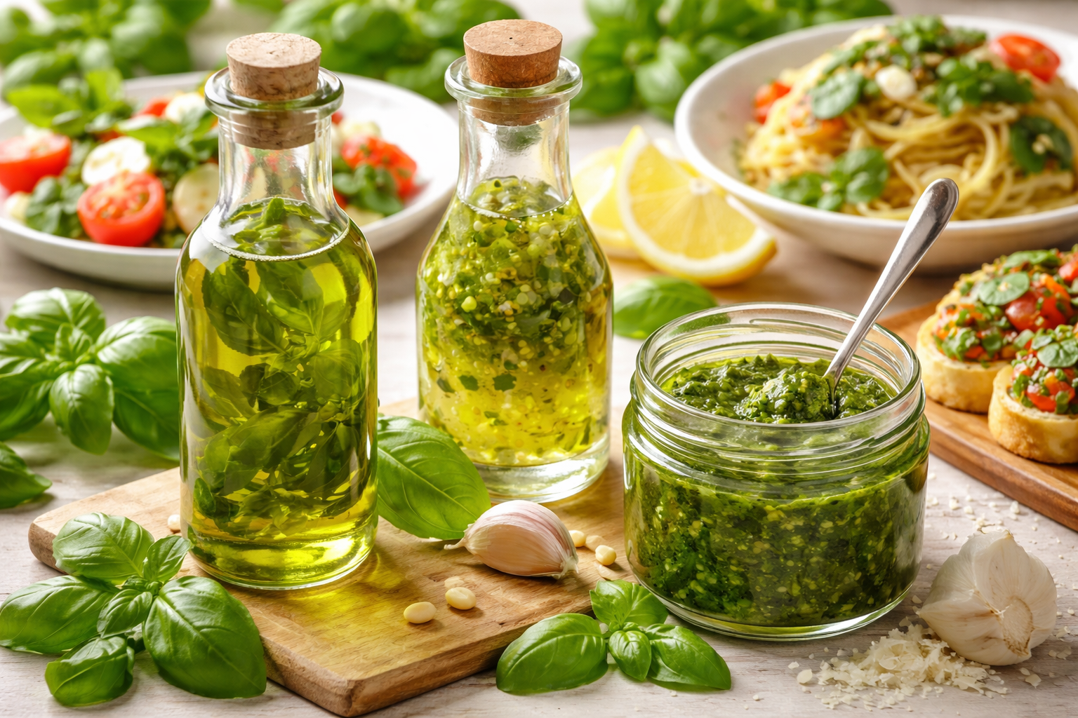 この章では、香りを手軽に移せるバジルオイル、さっぱりした料理を一段引き上げるバジルドレッシング、そして応用範囲の広いバジルペーストについて見ていきます。ここを押さえると、バジルは単なる葉ではなく、日常の料理を支える“香りのストック”へと変わっていきます。