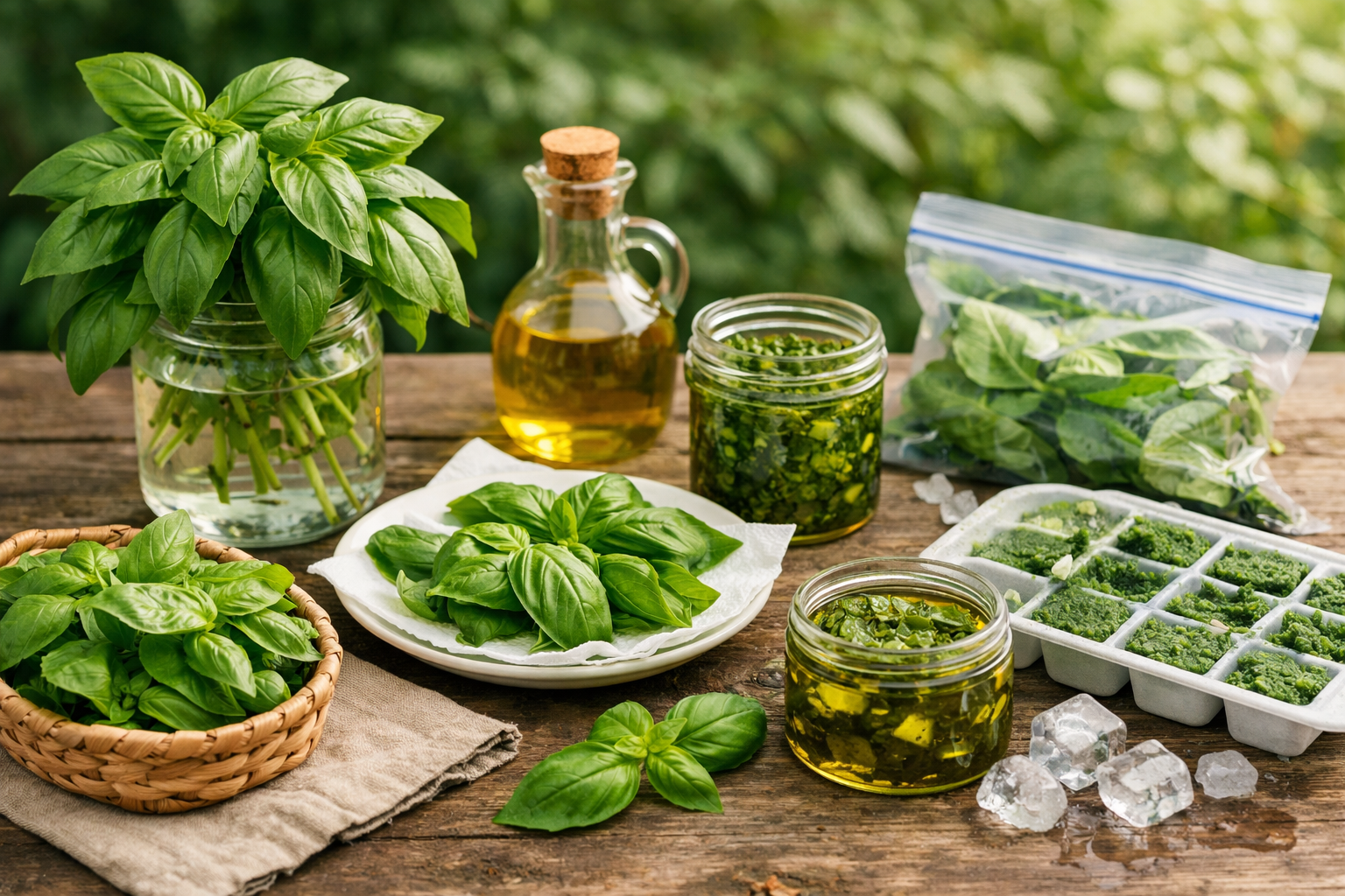 バジルの収穫後の保存で大切なのは、冷やしすぎや蒸れを避けながら、葉をできるだけ傷つけずに扱うことです。いちばん贅沢なのは採ってすぐ使うことですが、短期間なら水に挿す方法、用途によってはオイルや冷凍を使う方法も役立ちます。葉だけ保存する場合は、水分と圧迫に特に注意が必要です。