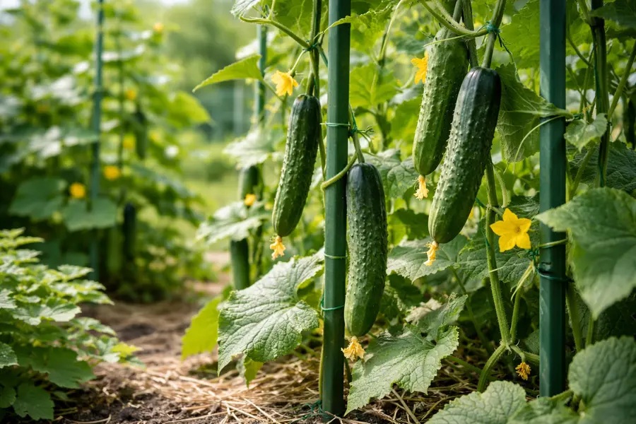 きゅうりの支柱立ては、つるがよく伸びる特性を活かした立体栽培の基本で、合掌式(V字・クロス型)や直立式がよく使われています。